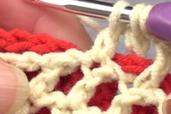 The start of the ‘[br+f]‘. After the in-between chain, the stitch is inserted into the same mesh stitch where you just made the previous stitch, at the back of the red, so that the diagonal line will run to the right. You make an extended dc, but you don’t finish it.