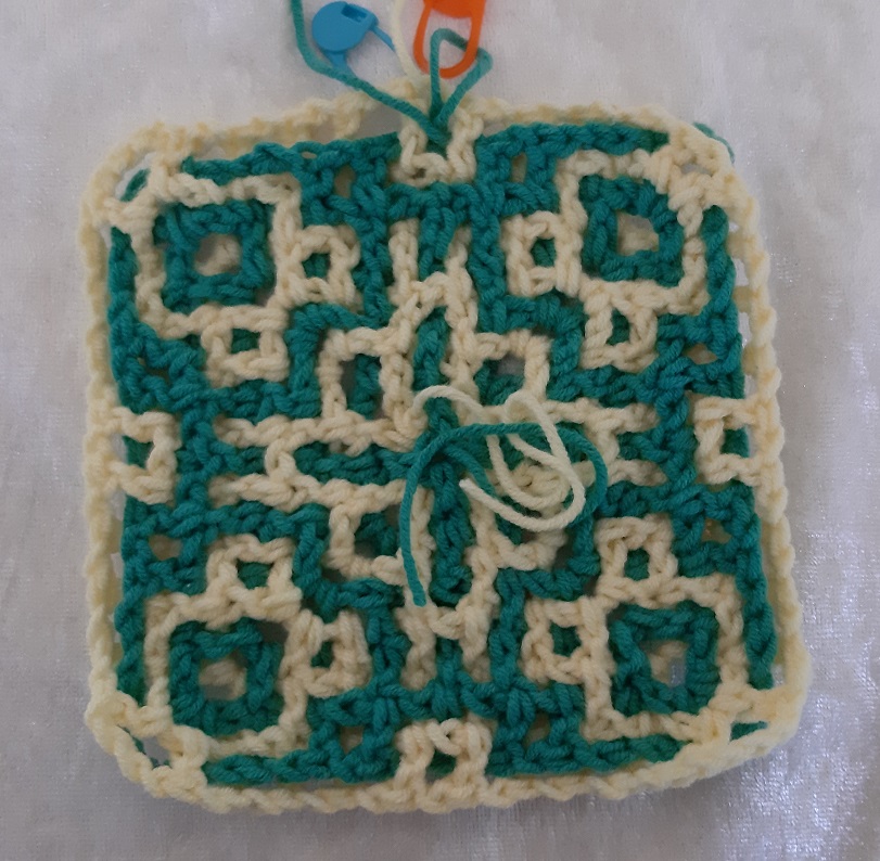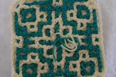 This technique is excellent for using variegated yarns with a gradual color change that’s short enough to get visible within a block. You can achieve the same effect by using yarns with colors that gradually change. See here for more info.