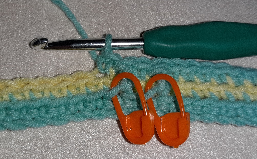 In this case it is easy, because we took our measures after row 1 by adding markers at the right spots. So you can now simply work through the loop at the marker. In the picture you can see where to insert the hook.