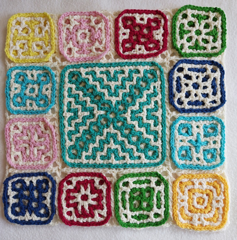To learn you how to do this in the round technique, I created a sampler where all the possible start situations of the blocks are covered. I created videos for all of them, and also how you can crochet all pieces together on the go.