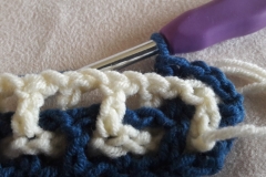 The next dc (after the in-between-chain, I will not mention that from now on), must be made on the front side. This will be made into the top of the third dc of the previous blue row. Fold the top of the white row to the back so you will not work into it.
