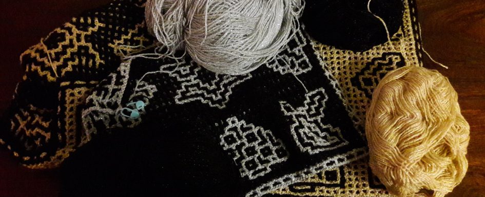 The colors do not show correctly in these pictures, it looks a bit better in the picture at the start of this blog. The left version is made with a gold and black glittering yarn (Alize Sal Simli), the right version with black and silver. That makes it look very luxurious. I will post it later when I manage to get better pictures.