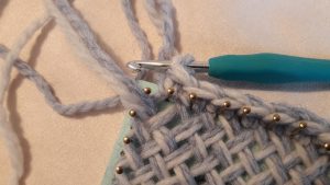 Corner D is very simple. You already have a loop around the corner nail there, so you just work through that right away. Make 2 stitches in this corner loop!
